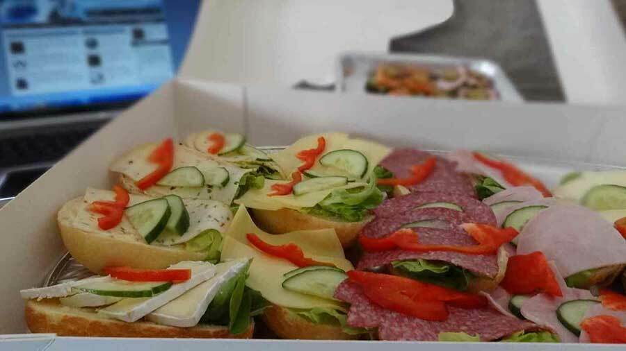 Diese leckere Brötchenplatte mit 15 Brötchen gab es übrigens zum Preis von 20 Euro beim Berliner Lieferdienst Bistro Pan.